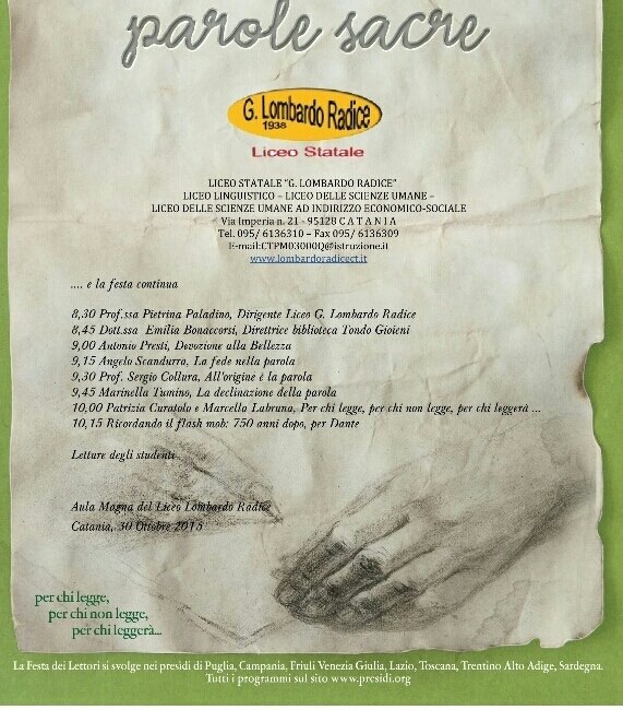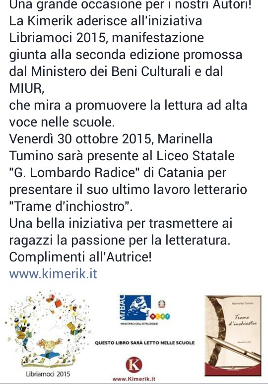 In occasione dell’iniziativa “Libriamoci 2015”, manifestazione giunta alla seconda edizione e promossa dal Ministero dei Beni Culturali e dal MIUR, che mira a promuovere la lettura ad alta voce nelle scuole, la prossima settimana dal 26 al 31 ottobre, incontrerò gli studenti di Ragusa e CATANIA.
