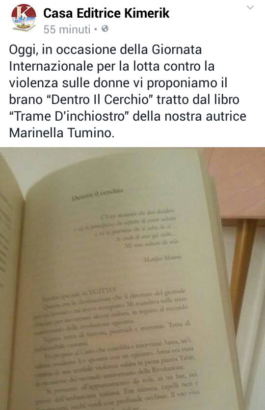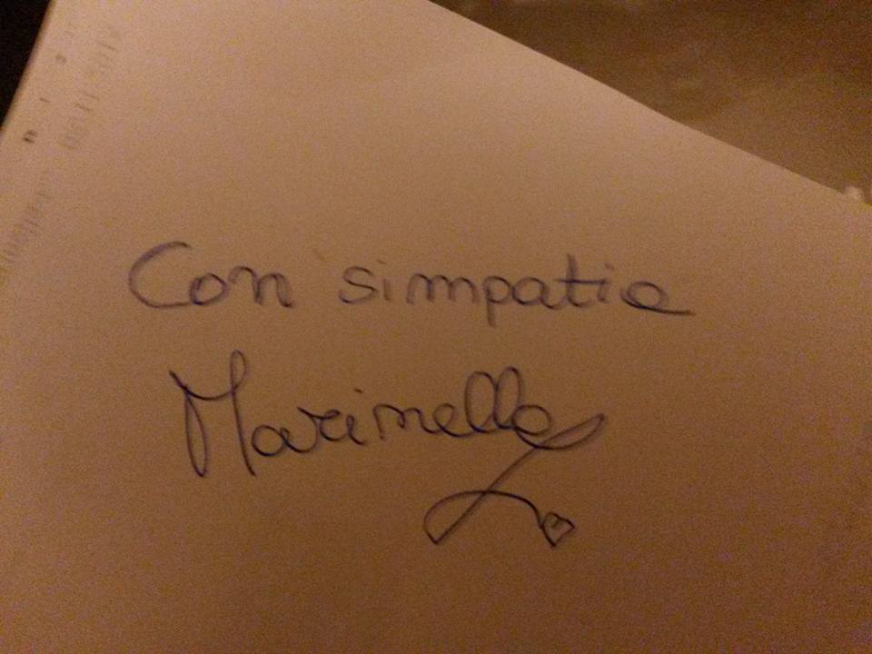 Lei:”L’ho riconosciuta dalla foto.Complimenti. Ho comprato il suo libro e l’ho letto tutto d’un fiato…è stata una dolce carezza per la mia anima… Grazie per le emozioni che mi ha regalato! Le dispiacerebbe farmi un autografo?”