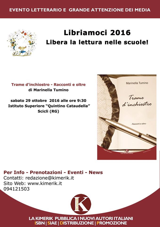 In occasione dell’iniziativa “Libriamoci 2016”, sabato 29 ottobre 2016, alle ore 9:30, Marinella Tumino sarà ospite dell’Istituto Superiore “Quintino Cataudella” di Scicli (RG).