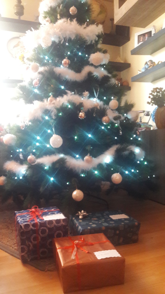 L’abete con le sfere e le luminarie era pronto, anche il camino e la ringhiera in legno che portava su per le scale erano stati addobbati.