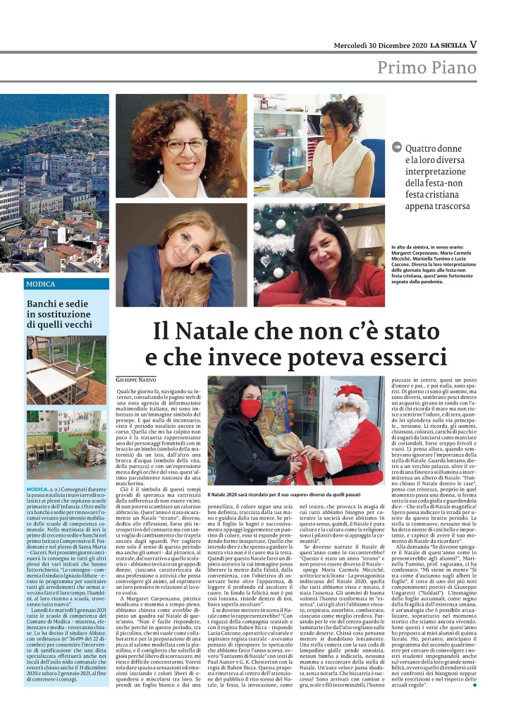 Così scrive il post su FB il giornalista Pippo Nativo: 4 Riflessioni, 4 Pensieri sul significato del Natale di quest’anno visto da 4 Donne ognuna con la propria sensibilità, ognuna in relazione alla propria attività. Qui di seguito, articolo pubblicato sul quotidiano “La Sicilia” di oggi (merc. 30.12.2020, p. V). Ringrazio Margaret Carpenzano (pittrice), Lucia Cascone (regista teatrale), Maria Carmela Micciché (scrittrice) e Marinella Tumino (insegnante) per la loro preziosa collaborazione. Un grazie anche alla sopra citata testata giornalistica per la consueta sensibilità.