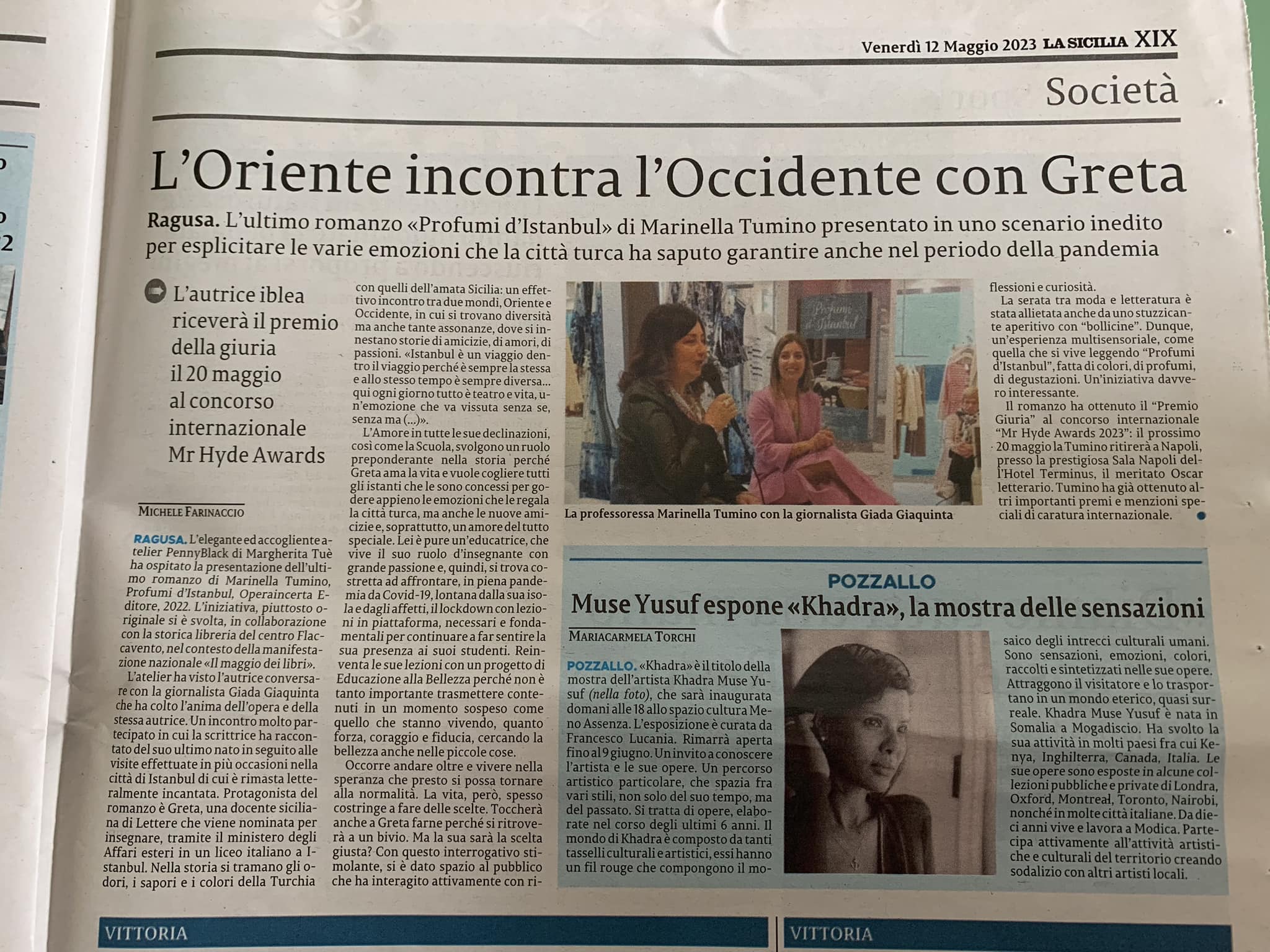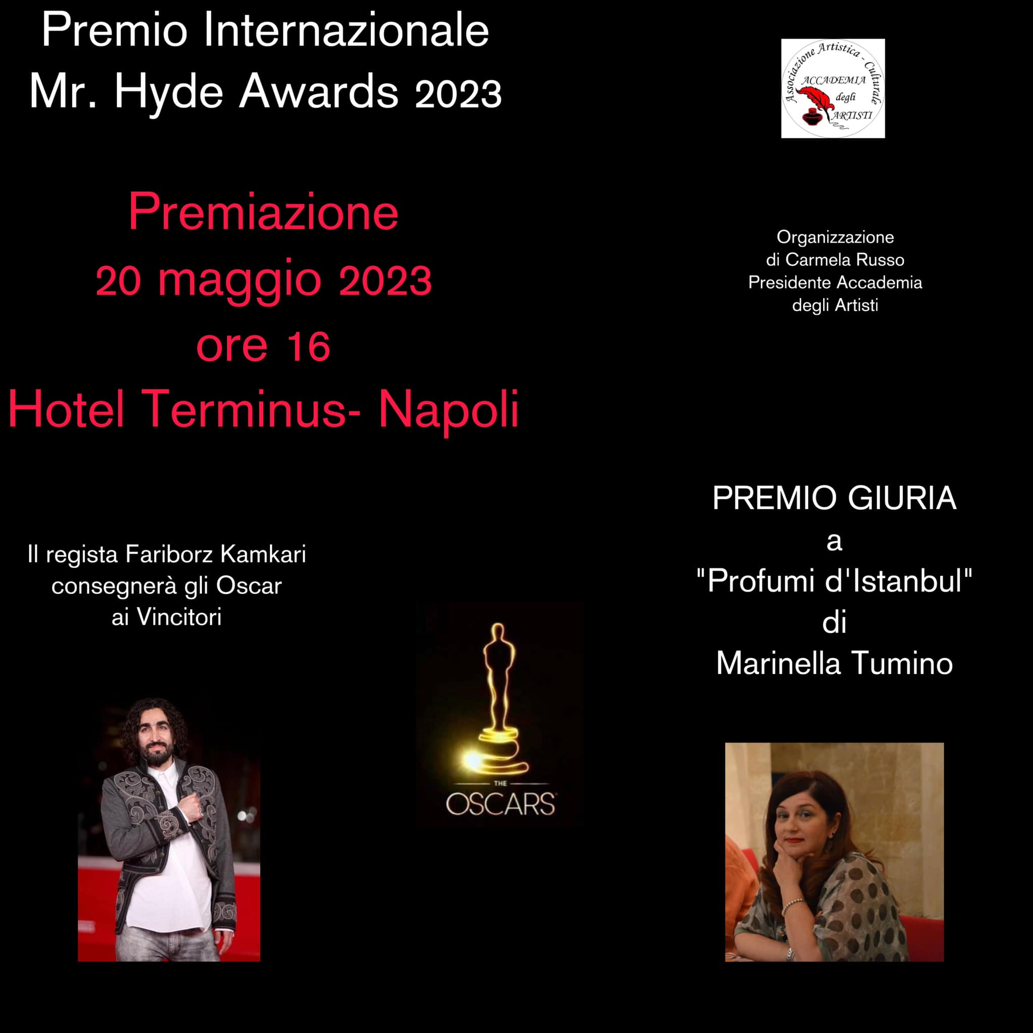 Comunico con immensa gioia che oggi ho ricevuto la notifica di aver ottenuto OSCAR – PREMIO GIURIA “MR. HYDE AWARDS 2023” per il mio figlio di carta PROFUMI D’ISTANBUL, Operaincertaeditore.Sono emozionatissima e grata non solo alla giuria, ma anche alla presidentessa Carmela Russo![]()